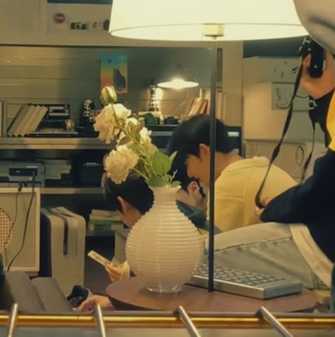 저 탁자의 꽃병에 활짝핀 흰색장미가 3송이, 꽃봉우리로 남아있는 장미 한송이인데