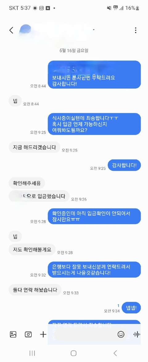 배달이 완료가 되고 30분정도 기다렸다가 연락이 없으시길래 문자를 드렸더니 지금 이체 해주시겠다고