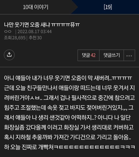 아니 얘들아 내가 너무 웃기면 오줌이 새버려..ㅠㅠㅠㅠ 근데 오늘 친구들만나서 애들이랑 떠드는데 너무 웃겨서 지려버린거야ㅅㅂ.. 그래서 겁나 필사적으로 중간에 참으려고 힘주고 조절했는데 속옷이랑 바지도 젖어버린거있지.,.ㅅㅂ 그래서 얘들아 나 생리 샌것같아 어떡하지..? 아니다 나 일단 화장실좀 갔다올께 이러고 화장실 가서 생리대로 커버하고 혹시 지하철 추울까봐 가져간 가디건으로 가리고 돌아옴.. 하 오늘 진짜로 개빡쳐ㅋㅌㅌㅌㅌㅌㅌㅌㅌㅌㅌㅌㅌㅋㅋㅋ