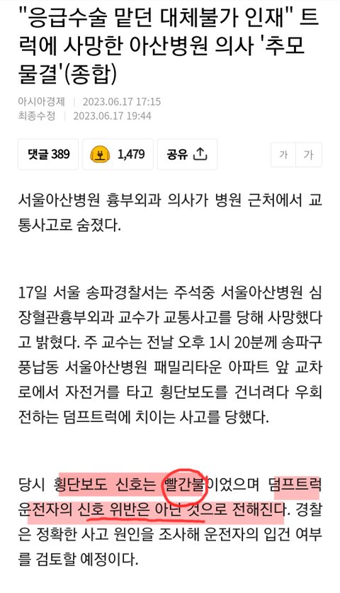 사고 당시 주 선생님께서 건너신 횡단보도의 신호는 빨간불이었습니다. 즉, 엄밀하게는 신호위반을 하신 고 주선생님의 과실또한 있는 상황에서 너무 트럭운전자만을 욕하거나 고인에 대한 감정만 표출하는것 같아 안타까워 적어봅니다