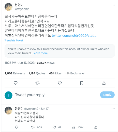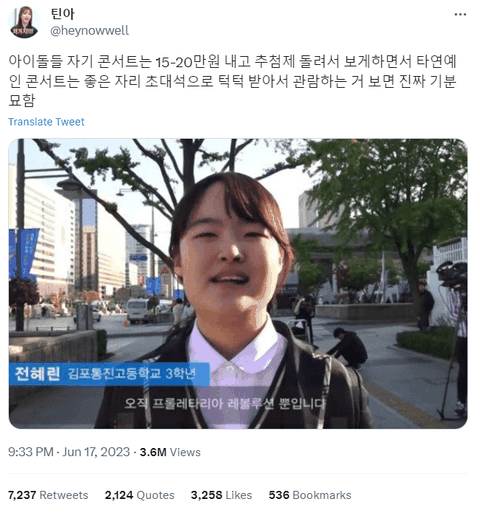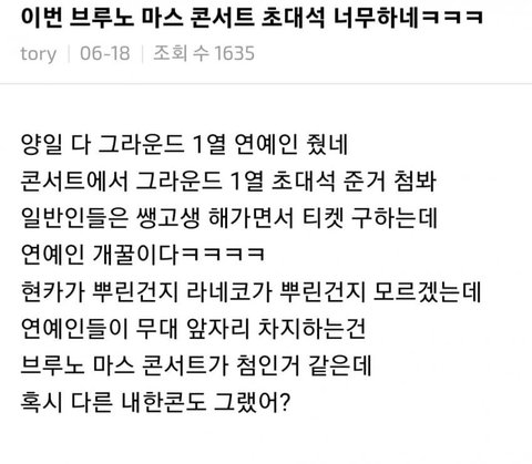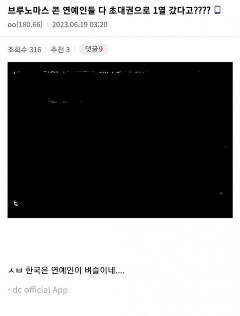 하이브 ㅈㄴ 웃긴게 자리 좋은데 지들이 초대권 찜콩해놓고서는 정작 지네회사 가수들 공연은 추첨제ㅋㅋㅋㅋㅋ 이게 나라냐? 앞줄 중앙에서 그 많은 자리 연석을 잡았다고? 웃기지마… 선선예매로 티켓팅 직접했다고 인증한 송혜교조차도 상당히 뒷자리더라 아예 애초에 1-3열은 막아놓고 티켓팅 열었다더만