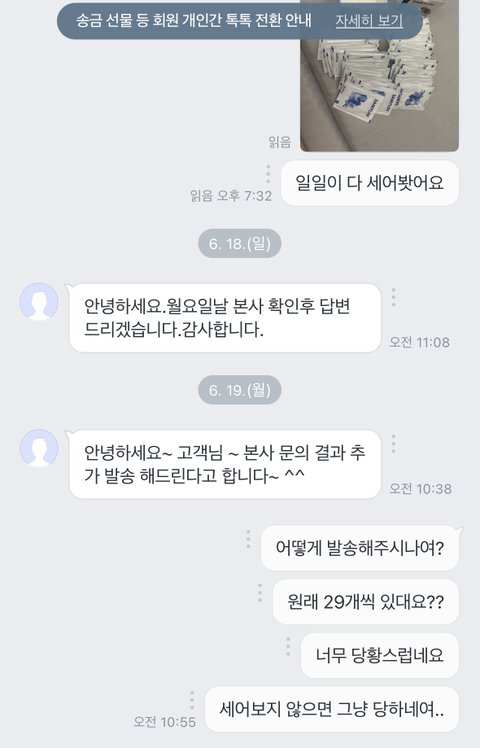 애기가 간이 안좋아서 강아지 간 보호제를 지속적으로 사서 먹이는데 (한통에 42400원씩 30포 30일짜리 항상 두통씩 시켜요)원래 구매하던 곳에서 품절되어 네이버 쇼핑에서 검색하여 구매하였습니자. 물건을 받자마자 이상하게 포장 박스가 살짝 열려있었습니다.그래서 뭐지 하고 수량을 세어봤는데 29포더군요 .잉? 하고 서너번 더 세어보고 혹시나해서 다른 박스도 세어봤는데 똑같이 29포였어요.소비자 입장에서는 한통이 수량미달이면 그냥 착오나 실수로 받아들여지는데 두통 모두 똑닽이 30포가 들어있으니 뭔가 사기당한기분이더라구요.4만2천원에 한달치라 하루에 얼마안되는 돈이긴 하지만 돈을 떠나서 두통다 수량미달은 좀 어이가 없어서 구매확정을 하고 리뷰에 29포만 들어있다고 알렸습니다.혹시라도 다른 구매자분들도 똑같은 일을 겪을가봐요.톡톡으로 문의를 남기니 부족한 두포는 보내준다는데 왜 마음이 풀리지 않을가요?