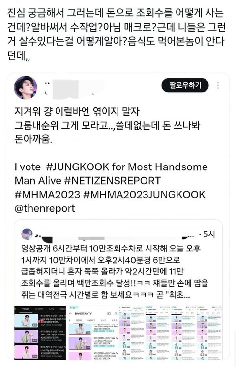 여기 타멤 후려치고 팬코하려고 끌고온 댓글에 추천누르는거봐ㅋㅋㅋ어제도 저 알못 기사뜨고나서 트위터 뷔정국 악개들이 앨범 나온 멤들 패면서 음모론 펼치고 있던데 여기 베플 꼬라지 보니깐 그 악개아줌마들 몰려왔네ㅋㅋㅋㅋㅋㅋ진짜 악개ㅅㄲ들 제발 xx버려
