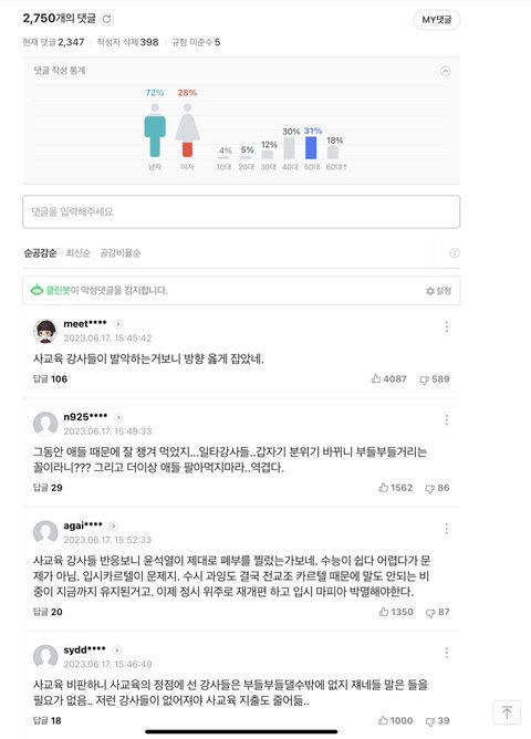 정시 인강보다 자소서 면접 대비 내신대비 족집게 학원 과외같은 수시에 필요한 사교육이 학생들 입장에선 훨씬 부담이고 몇 배는 돈 많이 듦 근데 이런 게 중요한 수시보다 한달에 많아봤자 교재값포함 20~30만원으로 전국에서 제일 질 좋은 강의 들을 수 있는 정시보고 사교육 격차 ㅇㅈㄹ 그것도 사교육 영향 제일 덜 받는 독서를 콕 집어서 ㅋㅋㅋ 걍 총체적 난국임