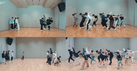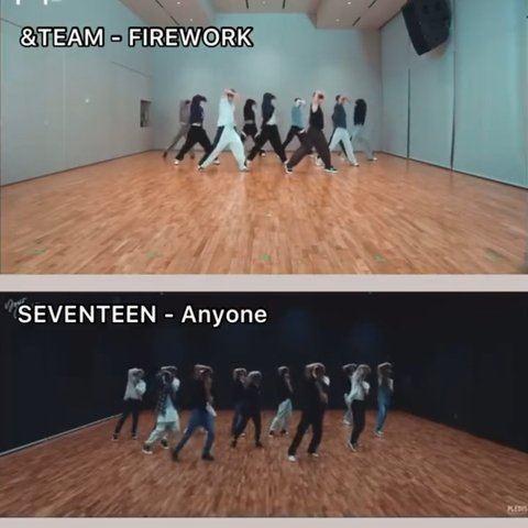 사진 윗부분이 하이브 레이블 재팬 소속 &TEAM의 Firework안무고 아랫부분이 세븐틴의 Rock with you 안무야.