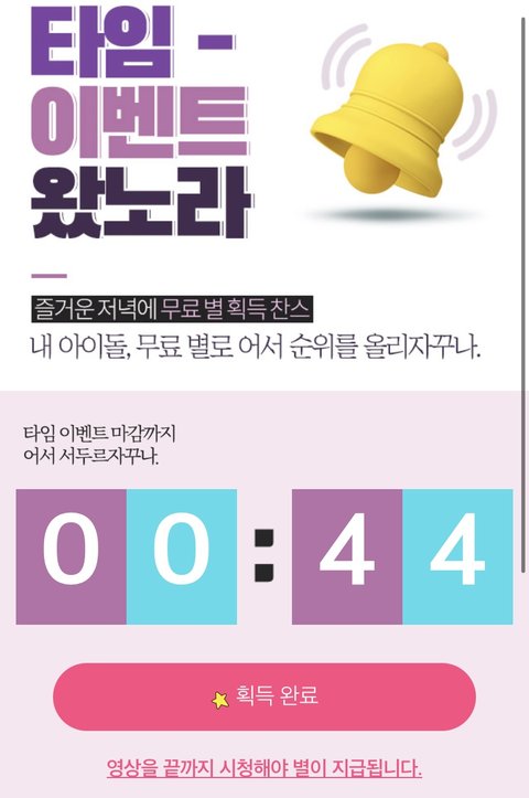 팬앤스타 어플 -하단 별 모으기 클릭 - 오늘의 공짜별 - 아래로 쭉 내리면 타임이벤트 떠