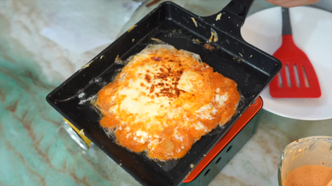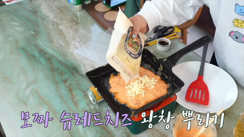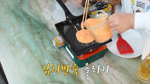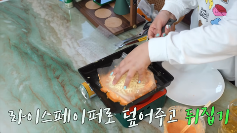 라이스페이퍼-김치전반죽-모짜렐라치즈-라이스페이퍼 순으로 올리고 뒤집기