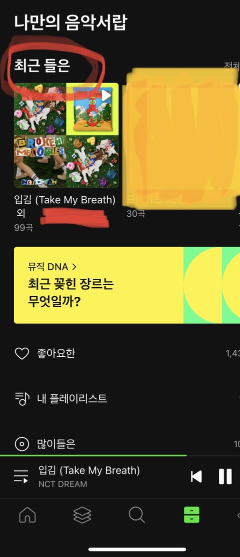 일단 사용하는 폰과 공기계 다 같은 계정으로 로그인을 해두 면 공기계로 노래가 계속 재생될 때 멜론창 아래에서 4번째 서랍을 누르면 최근들은 노래라며 저렇게 뜹니다! 이때 4분 정도가 지났는데도 최근들은 노래가 안 바뀌면 스밍이 끊긴겁 니다! 야매로 스밍 확인하는 법이야!
