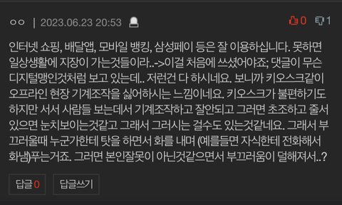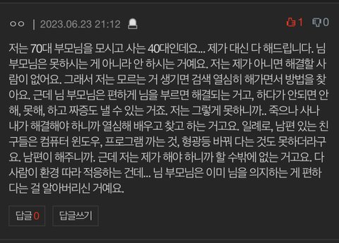 70대이신줄...나도 40대후반 들어섰고, 주변 동료들 4~50대가 많은데 저런사람 아무도 없는데, 벌써부터 저러시면 나중에 소리만 빽빽 지시는 불통노인네되시겠네요.