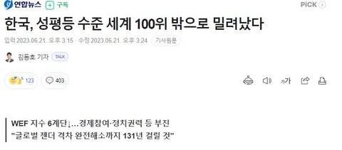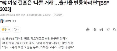 한국 정부에서 수 억 주고 의뢰한 미국 씽크탱크의 수석연구원도 한국 초저출산율 최초로 예견한 세계 최고의 인류학자도 성불평등과 여성에게 주어지는 과도한 의무가 원인이라고 하나 같이 지적하는데 귀막 눈막 중 여자도 군대가라며 의무를 더 짊어지게 할 생각 밖에 없음