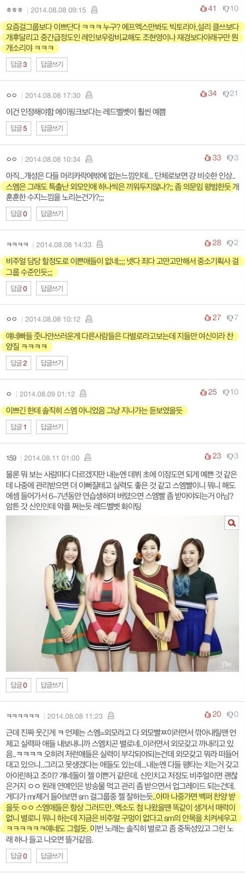 지금 4세대 여돌들 후려치려고 이용해먹는 아이린 보유그룹 레드벨벳도 현역 당시에 판녀들 반응 ^^ 판녀들은 그냥 여적여에 미쳐서 무조건 여돌들 줘패고 비교질해대고 얼평, 몸평, 후려치기가 일상인 언냐들임 다들 그냥 그러려니 해~~