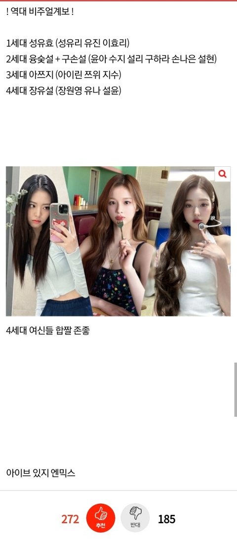 여돌 비주얼 3인방 애초부터 장유설로 땅땅 확정나고 계속 그렇게 불려왔는데 슴창퀴들 판먹더니 머릿수로 장카설 ㅇㅈㄹ하면서 밀고있음