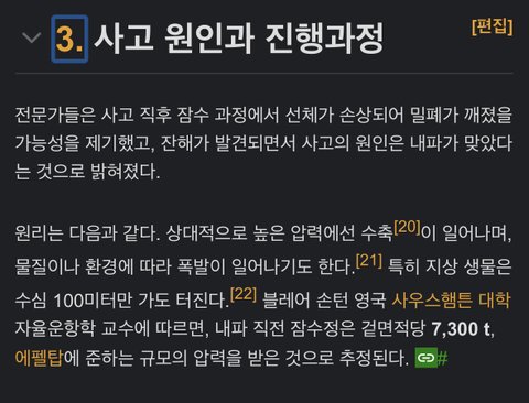 폭발사고라는데 폭발이 아니고 반대로 찌그러진 거라고 보면 됨. 이게 과학자들 추정이고, 정황상 맞는 추측으로 보이는데 탑승자들은 익사나 산소 고갈때문에 죽은게 아니라 수압이 너무 강해서 폭발의 반대라고 볼 수 있는 내파로 으스러져서 죽은거임