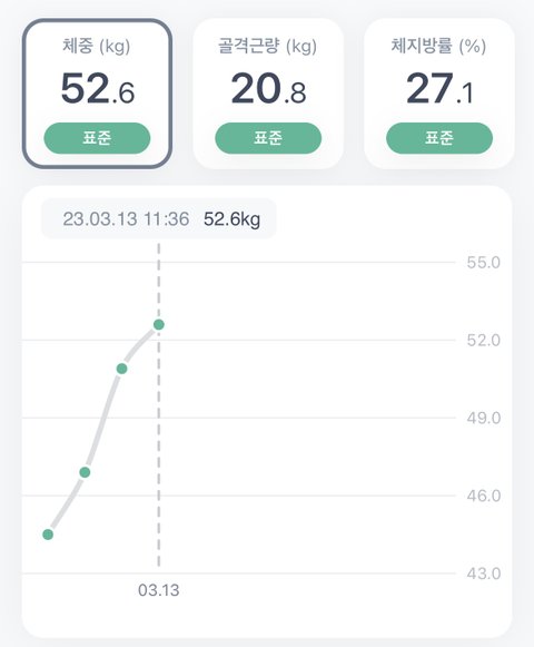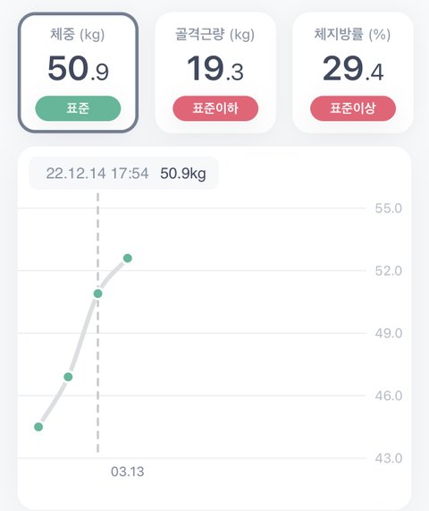 52가 가장 최근인디 전날 좀 먾이 먹고 잰 거라 음식무게도 잇을 거 같음 아마 51에서 시작했을듯 체지방률 29나온 거 보고 식겁햇잔니 ;-