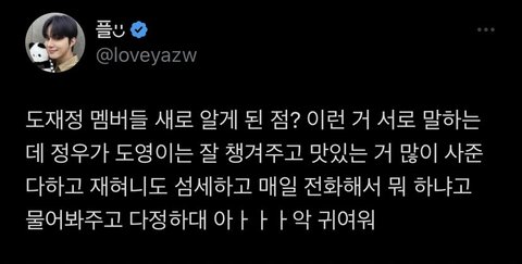 나는 재현 정우 관계성의 새로운 발견이라고 봄 ㅋㅋㅋㅋ 도영이와의 관계성은 그래도 어느정도 알고 있었단 말이야. 물론 도영이가 이렇게까지 고생하는 엄마롤일줄은 몰랐지만..(도리더 홧팅..) 재현이가 정우랑 생각보다 잘 놈 ㅋㅋㅋㅋㅋ 그리고 내 예상보다 귀여워하고 있었음에 충격... n년동안 좋아하면서 처음 알았단말이지..