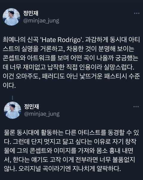 +) 다시 한 번 말하지만 표절이라고 주장하는 거 아님ㅇㅇ 오마주 레퍼런스 다 알겠고 반어법인 것도 알아 근데 굳이굳이 동시대 아티스트(그것도 본인보다 늦게 데뷔한 앨범 한 장짜리) 실명 거론해서 ‘Hate ㅇㅇ’ 을 쓴다? 그 아티스트 콘셉트 이미지 전부 흉내내면서 막상 가사에는 올리비아 로드리고 이야기가 썩 많이 나오는 것도 아니고… 제목을 그렇게 지은 이유를 설득력있게 풀어내지도 못했음 결과적으로 그냥 로드리고 이름으로 어그로 끌고 컨셉만 실컷 따라한 게 되는 거잖아ㅋㅋㅋ