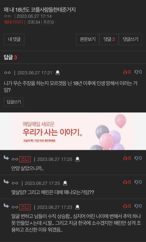 ㅈㄴ 자기 사진인지 남의 사진인지 모르겠는데 맨날 뭔 사진 올리고 18년도 이후로 자기 외모는 ㅎㅌㅊ되고 남들은 ㅅㅌㅊ 됐다고 자기거 뺏어갔다 ㅇㅈㄹ함... 본문 사진에서 해린은 갑자기 왜 나온건지 모르겠음ㅋㅋ 안양이랑 해린이 조용한거랑 뭔 상관임 대체... 진짜 조현병이 무서운듯 날때부터 조현병은 아녔을거 아냐