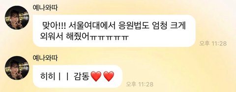 우리 학교 축제 스케일 평소에 진짜 기대하면 안되는 편인데 예나 온다고 해서 완전 신나있었고 학교에 한 최예나 팬인 학우분이 사비로 응원법 리그램 돌리고 학교 축제 같지 않게 응원법 다 해줬었거든