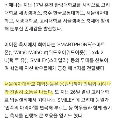 나 서울여대생이고 이번 축제에 최예나 왔었어