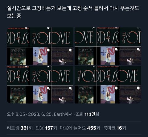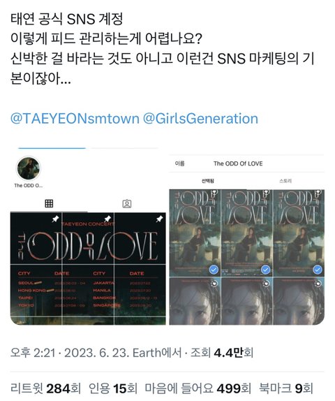 대만콘의 경우에는 다른 슴돌과 같은날 콘서트를 진행했는데 다른 돌은 게시물들이 많이 올라왔음, 그러나 태연 공계는 게시물이나 스토리가 단 한개도 올라오지 않다가 날짜 지나기 직전에나 겨우 한두개 올라옴