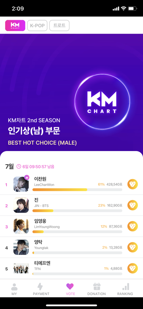 마이원픽 km차트 인기 남자부문에서 본 건데 bts 진이가 압도적으로 밀리네이찬원 팬덤 ㅎㄷ