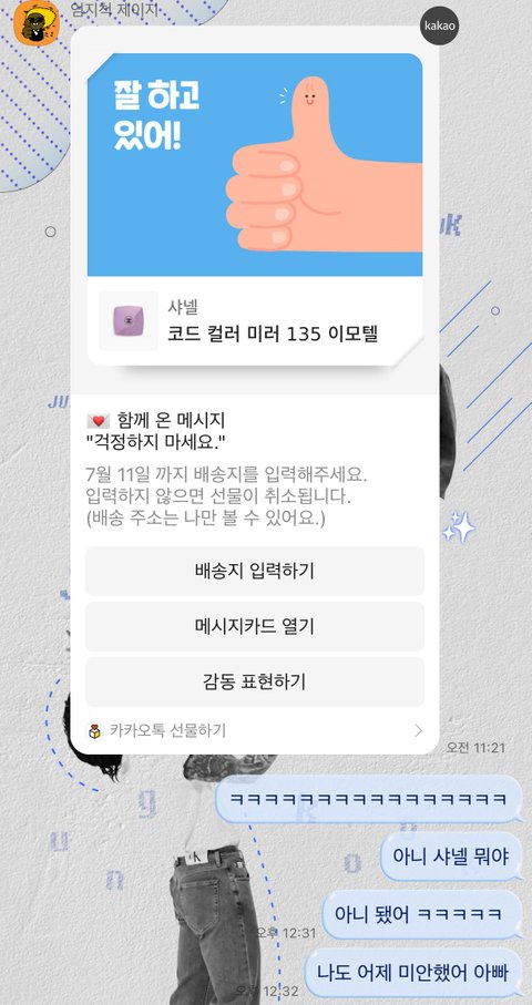 이 말 듣고 약간 풀렸다가 점심 먹고 아빠가 카톡 와서 ㅜ봤는데 메시지 카드에 잘하고 있다고 편지 쓴 다음에 보냈더라구… 근데 이와중에 샤넬 보라색 거울은 내가 방탄 좋아하는거 알아서 일부러 보낸거래ㅠㅠ 이거 보고 친구들 앞에서 엄청 울었다… 생각해보면 난 부모님 돈으로 공부하는데 부모님 불안하게 한게 너무 내 잘못인가 싶기도 하고 ㅠㅠ 누구보다 덕질 응원해주고 대학가면 지원도 엄청 해줄 분들인데 난 너무 내 생각만 했었나봐…
