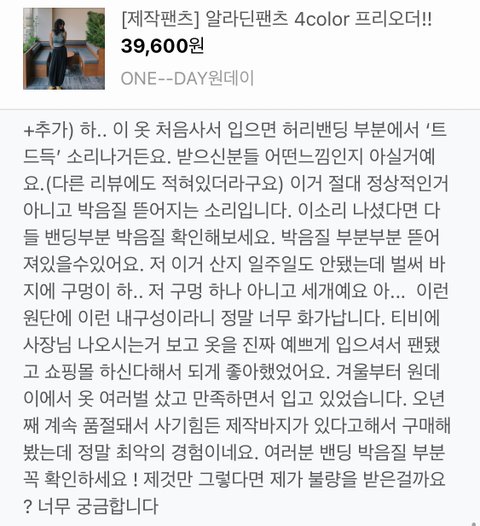 2. 일주일도 안됐고 단시간 입은 바지에 벌써 구멍이 세개가 나고 입고벗을때마다 밴드에 투드득 소리가 나는 것은 내구성에 문제가 있는 제품이라 판단되었음.
