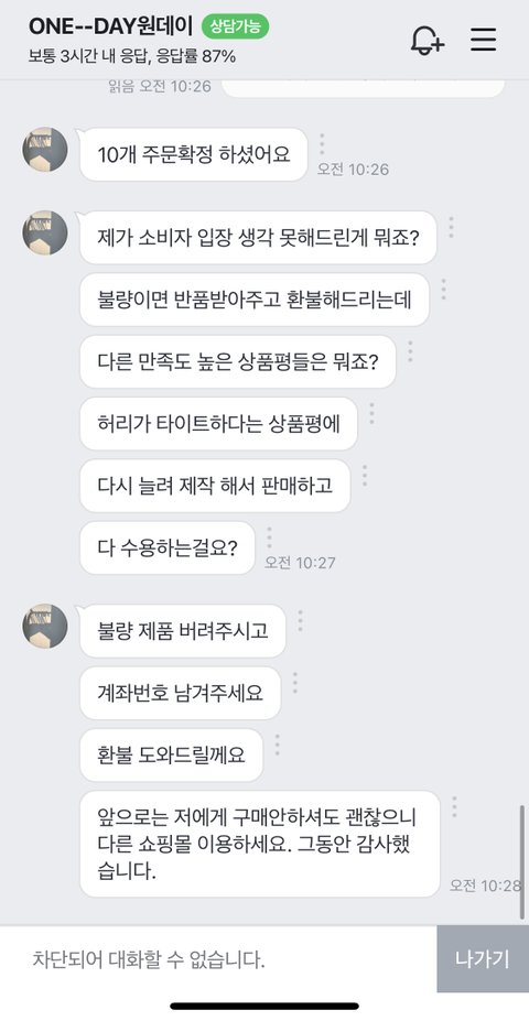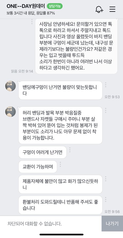 2. 저렇게 이건 불량이니 옷은 버려버리고 환불해 주겠다 하고 저를 바로 차단해 버리셔서 뭐 계좌를 어디다 남겨야 하나 하고 있다가 큐엔에이에 계좌 남겼는데 뭐... 글쓰는 현재(7월5일 오후 12시)까지도 입금안해주고 있습니다.