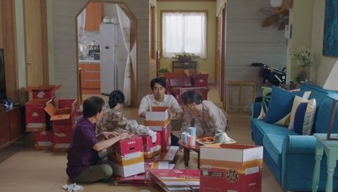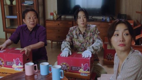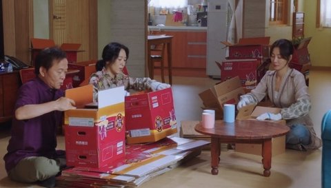 이장님댁에 다같이 모여서 박스 접는 중