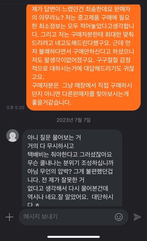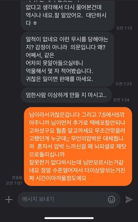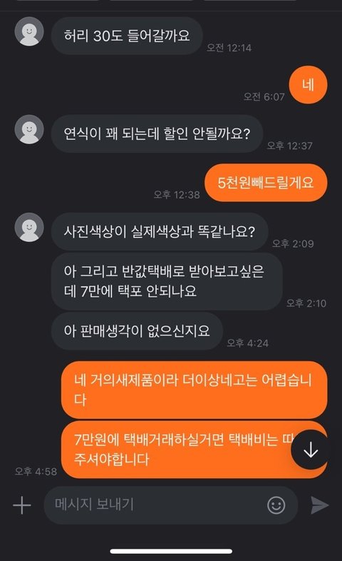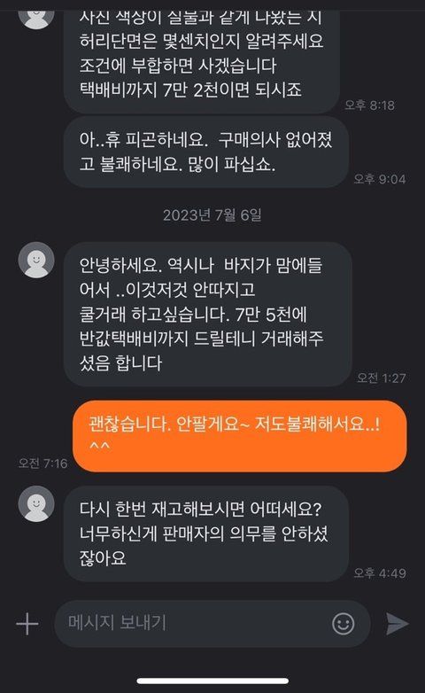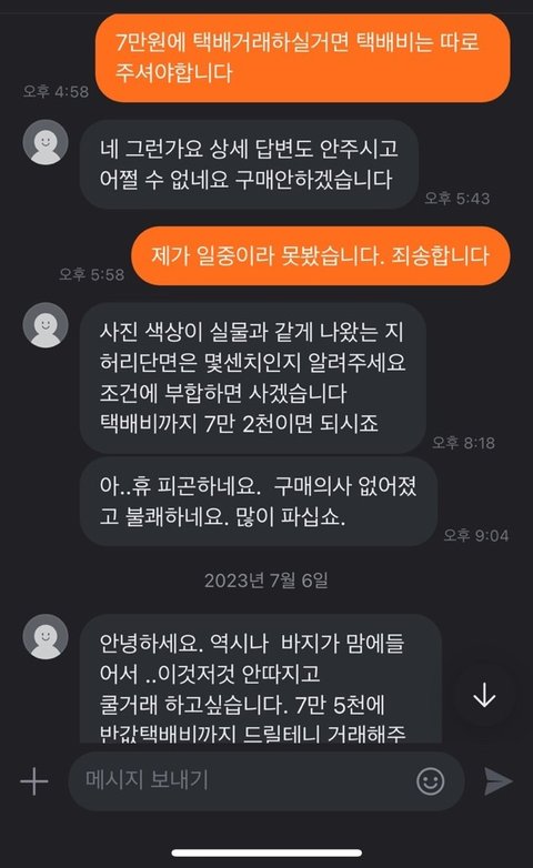 칼하트 바지 7만원에 팔다가 이정도 소리까지 들어야되낰ㅋㅋㅋㅋㅋㅋㅋㅋ 싶은데..맞나요? 이렇게 친절하게 하는건가요? 제가 예민충인가요? 진심 당근에 모 팔수있는거에요?다들 어떻게 하시는지 궁금합니다; ;;
