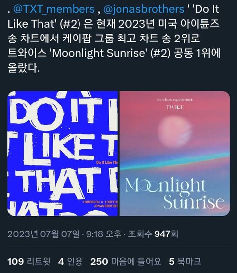해외겨냥해서 나온곡이여도 이정도 성적이면 ㄹㅇ 개지리는거 아님? 왜 자꾸 성적이 어떻다 하는거임 +야 아이튠즈 1위란다 정병들아 조용히 사라져