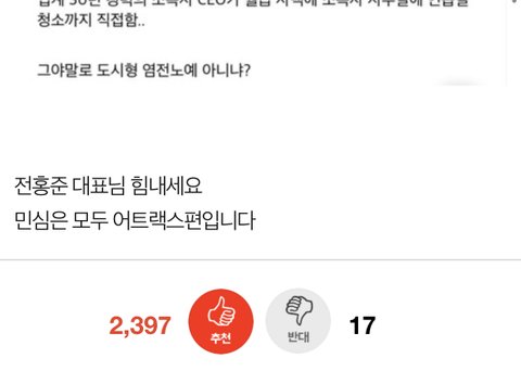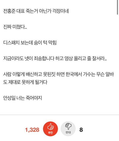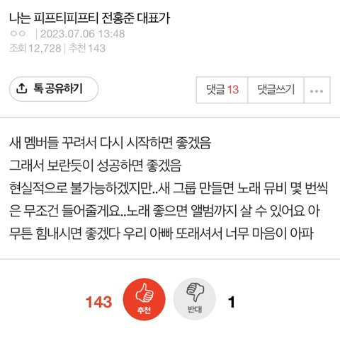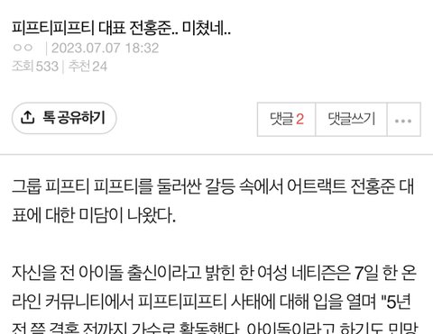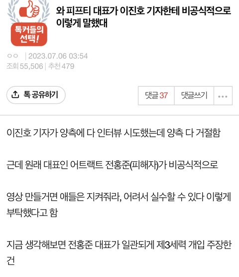 네이트판 특성상 “피프티 멤버들 개1샊이들이네” 같은 글이 톡선 올라오는게 맞는데 톡선 올라오는 글들 전부 “인성좋은 ‘전 홍 준’ 대표님 너무 불쌍해ㅠㅠ” 같은 글들이라 회사에서 언플하는것 같기도 하고..ㅋㅋ