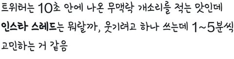 스레드는 걍 짭위터임ㅠ 트위터 싫다면서 트위터에서 오억년전에나 유행했던 짤 밈 말투 다 가져다쓰고 자기가 유쾌한 망가진 트창인줄 아는 마치 트위터리안들 담배필때 이제야 불을 발견한 원시족같은 이제야 불 발견했으면서 나대는 꼴사나운 느낌 자기가 쓴 글이 다 트위터에서 나온건데 그러면서 트위터가 싫다고함 이게 무슨..애초에 갓반인싸들이 트위터 특유의 정병감성 따라하려고 하는것부터가 이상함