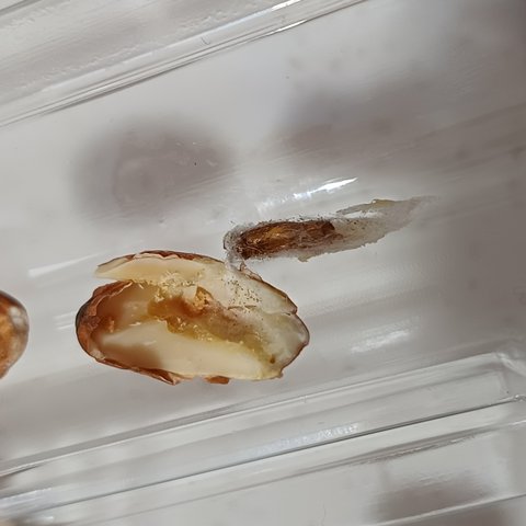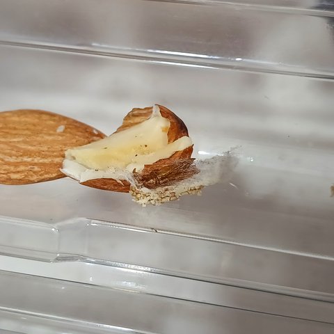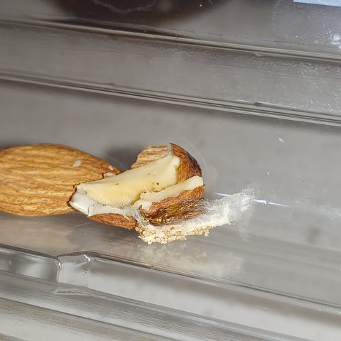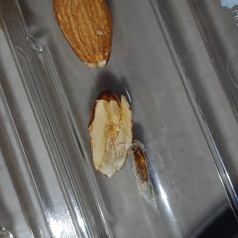 그래서 이게 뭐지..? 싶어서 아몬드를 반으로 쪼개려고 힘 살짝만 줬는데 바로 깨지더니 안에 무슨 알처럼 막 조그마난게 있어서 1차로 물음표???. 그리고 실뭉텅이와 함께 벌레가 나왔는데 아몬드 세로크기만큼 크고 날개까지있는.. 징그러운 몸통이 있는 벌레 보고 2차로 대충격...