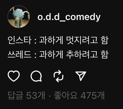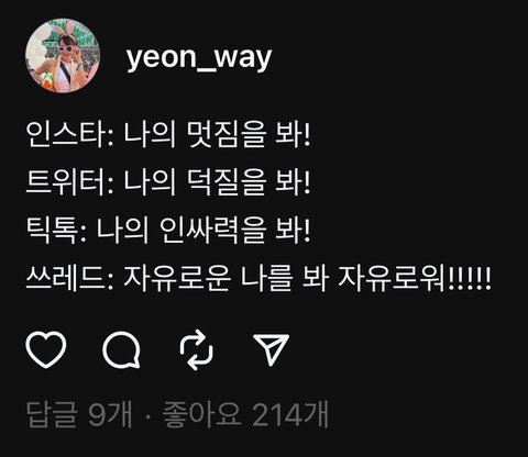 트위터도 그닥 좋아하진않지만.. 트위터는 걍 아무말 내뱉다가 운좋게 코드 맞아서 알티타는느낌이면 저기는 처음부터 용쓰고 웃기려는느낌이 많이드는것같음ㅋㅋ