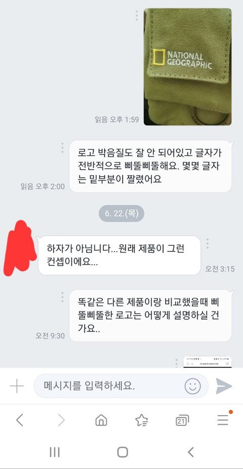 제가 모사이트에서 내셔널지오그래픽 카메라 가방을 사게 됐습니다.근데 로고가 삐뚤삐뚤하고 밑부분이 잘린 부분이 있어서, 불량이라고 생각이 들어서 환불을 요구했습니다. 우선 사진을 보여주겠습니다.