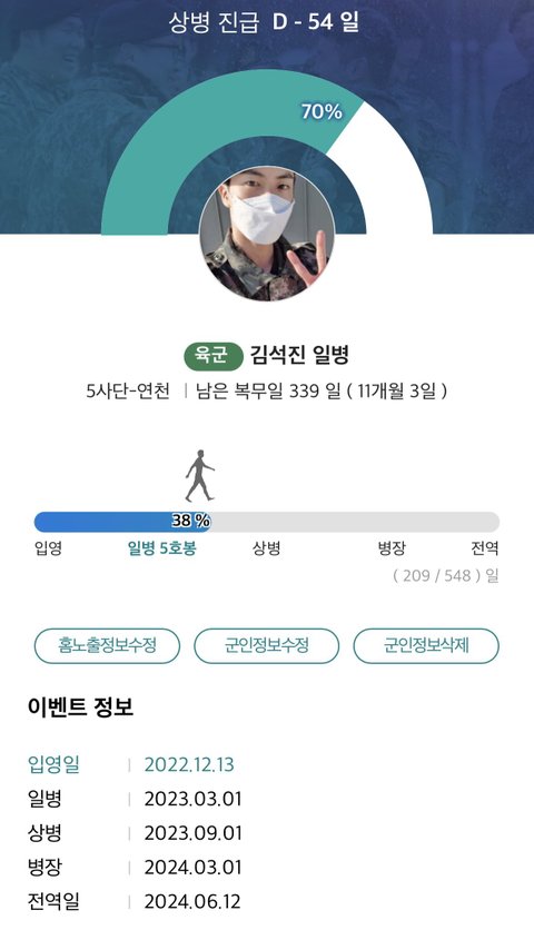 엥 벌써 상병이 된건가??? 상병되려면 진급일은 9월 1일. 특급전사달성할 경우 조기진급을 시행해 일병 4개월차까지 특급 전사달성할 경우 > >상병은 2개월<< 병장은 1개월 조기 진급하여 최대 3개월 정도 병장을 일찍 진급할 수 있는 기회를 주고 있음 근데 그걸 해낸 김석진 상병 ... 개발린다