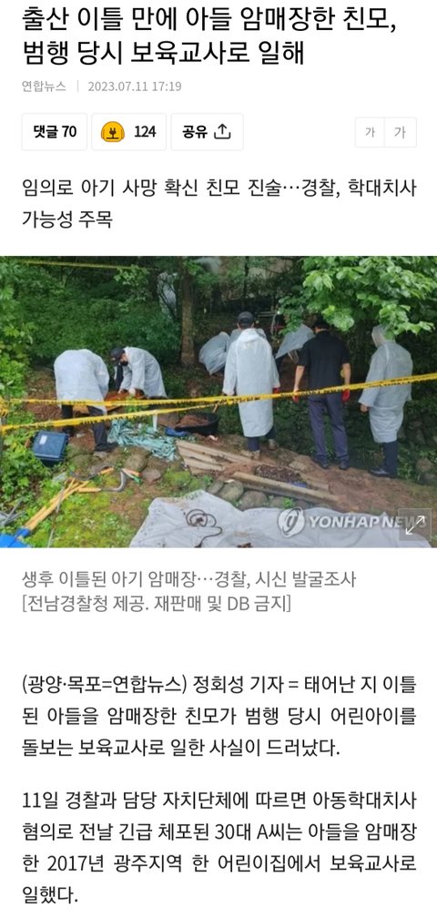 낳은지 이틀만에 아들 암매장한 보육교사..