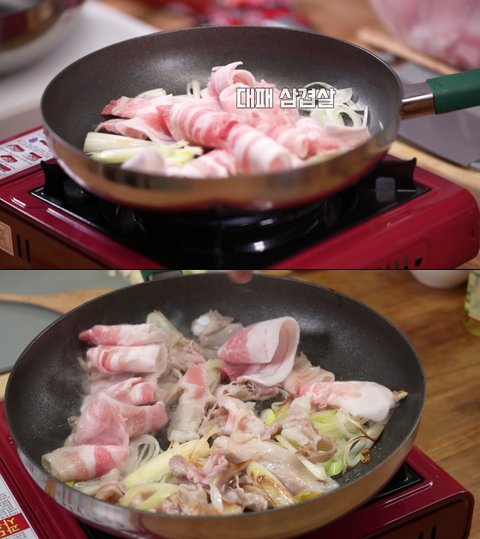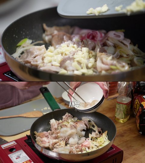 대패 삼겹살 + 다진 마늘 + 새우 넣어서 볶기