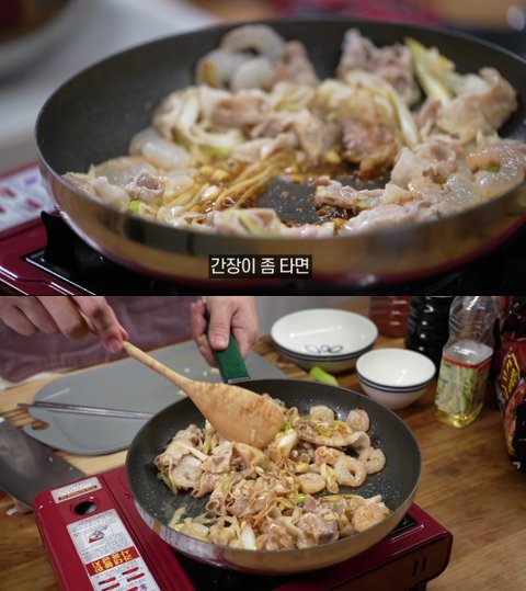 볶다가 간장 한 스푼 + 액젓 다섯 방울 넣고