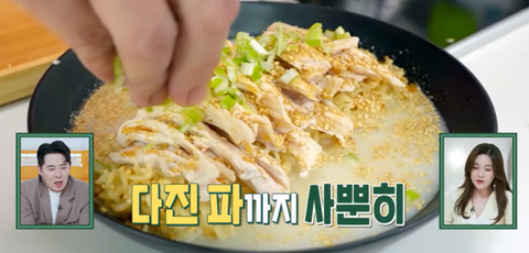 그릇에 면 넣고 육수 부어준 다음 닭가슴살 올리고