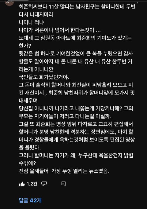 할매 5시간 조사받고 집 가니까 할머니 짐이 문앞에 내놔있더래...이야 그거듣고 진짜..말이 안나왔음 모르는 할머니 한테도 저렇게는 안해 카라귤라 글보면 남친이랑 최중희가 다급하게 도움메일 보냈다고 함 당연 할머니가 먼저 아닌가?최준희는 일단 여론 잠재우는거 밖에 안보여 진심이 안느껴져 할머니한테 사과한다 하더니 학폭때처럼 사과했다 하고 뒤에선 또 안하겠지