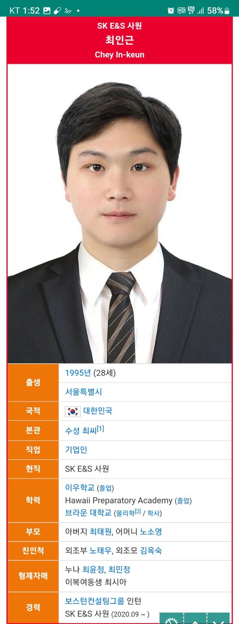 (사진4 설명) 최태원 SK그룹 회장의 장남 최인근 매니저 <출처 : 네이버 나무위키>
