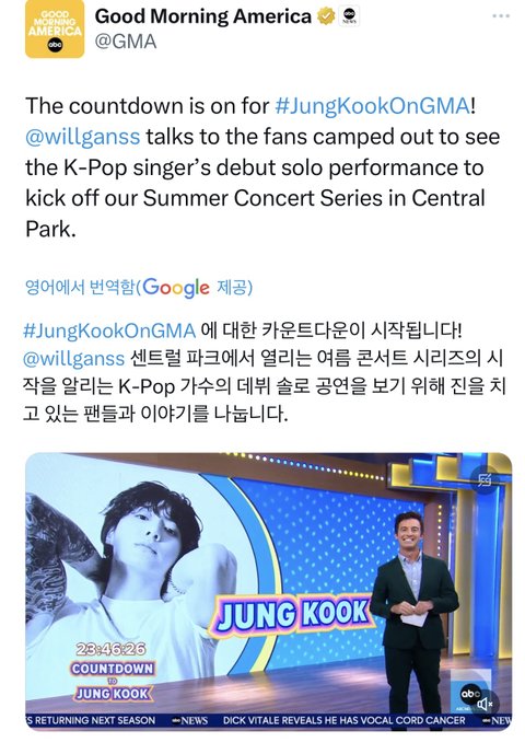 정국이 굿모닝아메리카에서 무대하는거 카운트다운까지 함