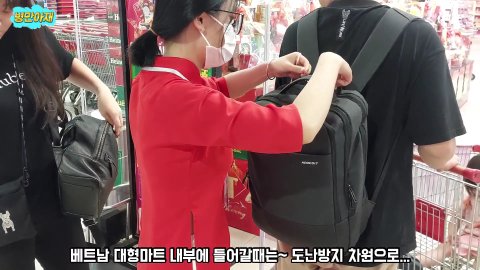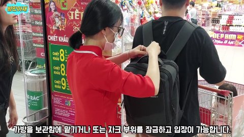 물품을 사는 마트안에 들어가기 위해서는 자크가 있는 조금 큰 가방들은