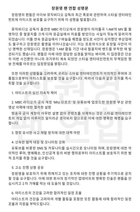 딴건 몰라도 고소는 진짜 좀 해라 장원영 악플러중에 진짜 선 씨게 넘는애들 있는데 그런것들은 지들이 알아서 선넘어줘서 고소만 하면 무조건 잡혀가겠더만 스타쉽은 끝까지 애들 화제성 이용해서 돈벌생각만 하지 제대로 된 케어를 안해주는거같음 진짜 고소는 무조건 좀 했으면