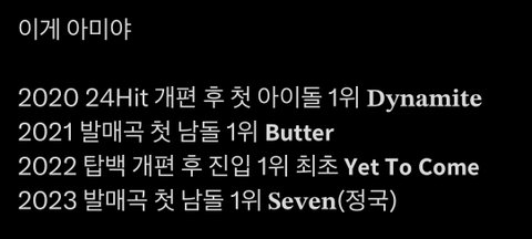 7월 14일 발매된 정국의 'Seven'이 2023년 발매된 남자아이돌 노래 중 최초로 1위한 곡이래!