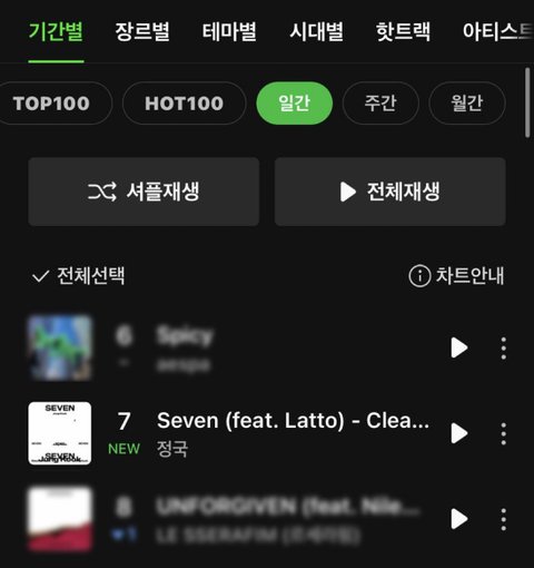 세븐 서수 일간차트 7위진입이야 ㄷㄷ