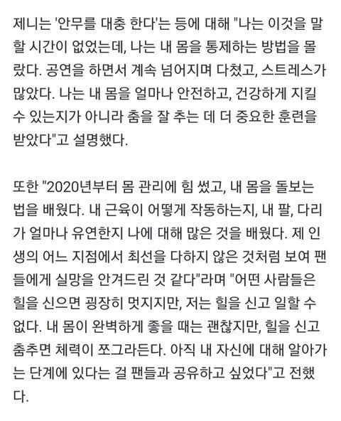 제니 안무 틀린게 미안해서 몸 관리에 신경쓰는중이래ㅠㅠ