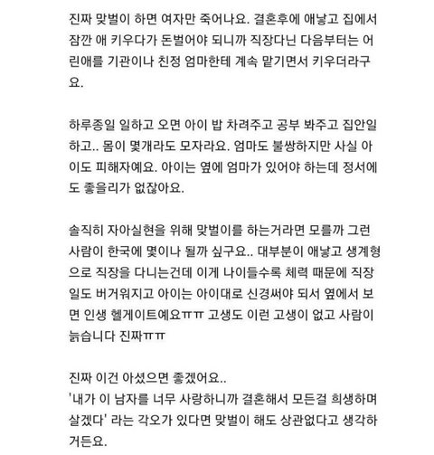 외벌이들은 남편한테 감사하고 살았으면 한다.어거지로 지들 힘들다고 호소해서 갑질하려고 하지 마라 그러다가 이혼당한다.